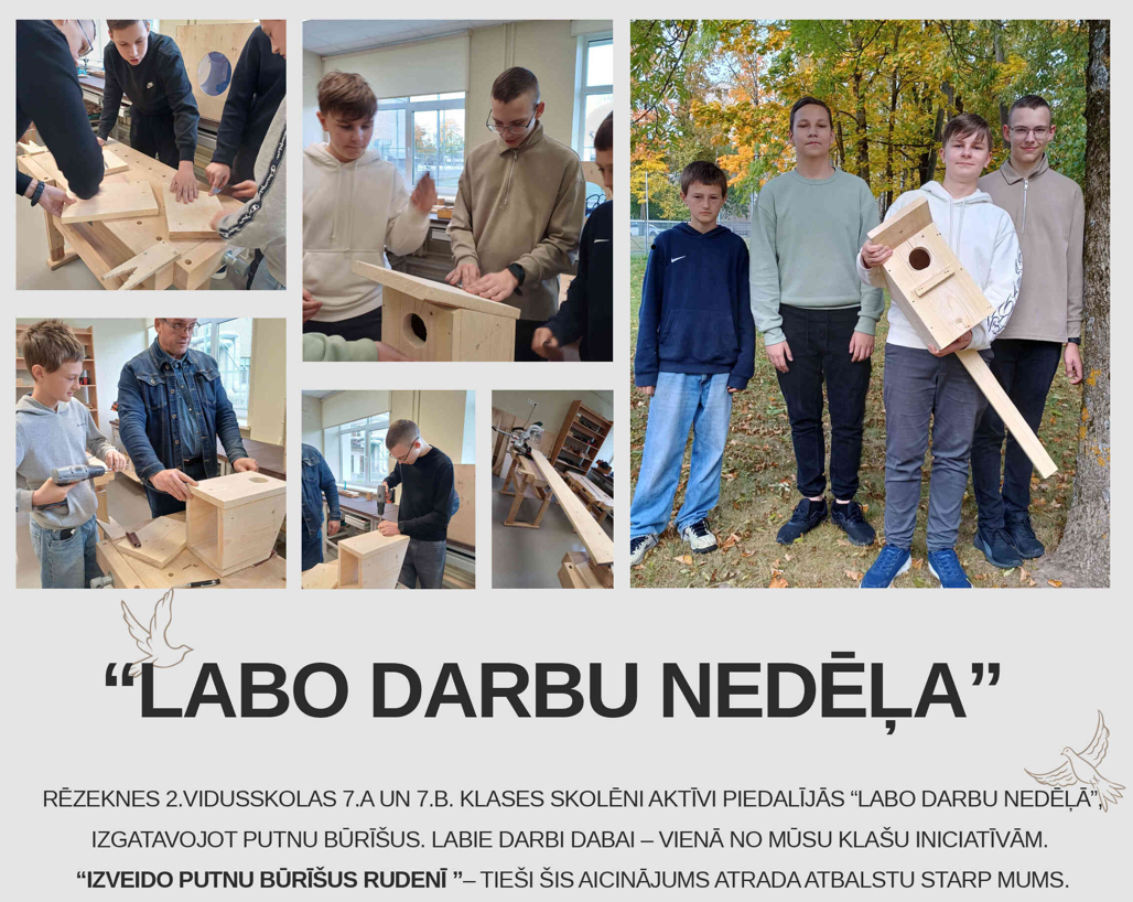 Rēzeknes 2.vidusskolas 7.a un 7.b. klases skolēni aktīvi piedalījās “Labo darbu nedēļā”, izgatavojot putnu būrīšus. “Izveido Putnu būrīšus rudenī ”–